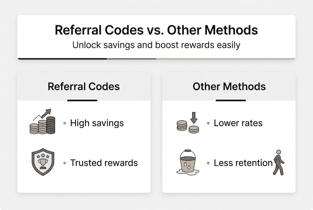 Here's a practical comparison of how referral codes stack up against other discount methods: